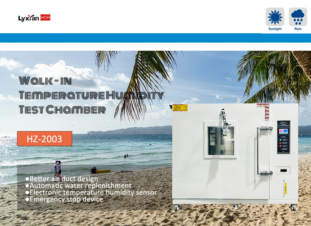 Box and package Walk-in constant temperature and humidity testing machine is suitable for the whole machine or large-scale parts to do the low temperature, high temperature, the change of high and low temperature, constant humidity and heating, high-low temperature alternating humidity and heating test. Provide large-scale parts,semi-finished product, finished product for Large-scale temperature and humidity testing environment space to industry. It is mainly composed of control panel, switchboard, moisturizing base plate blower, heating machine, humidity machine, refrigerator. And we also can design the chamber size and function according customers’ need. Block type enclosed cabinet,nice appearance, scientific design.