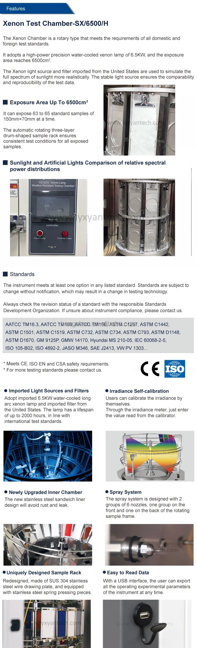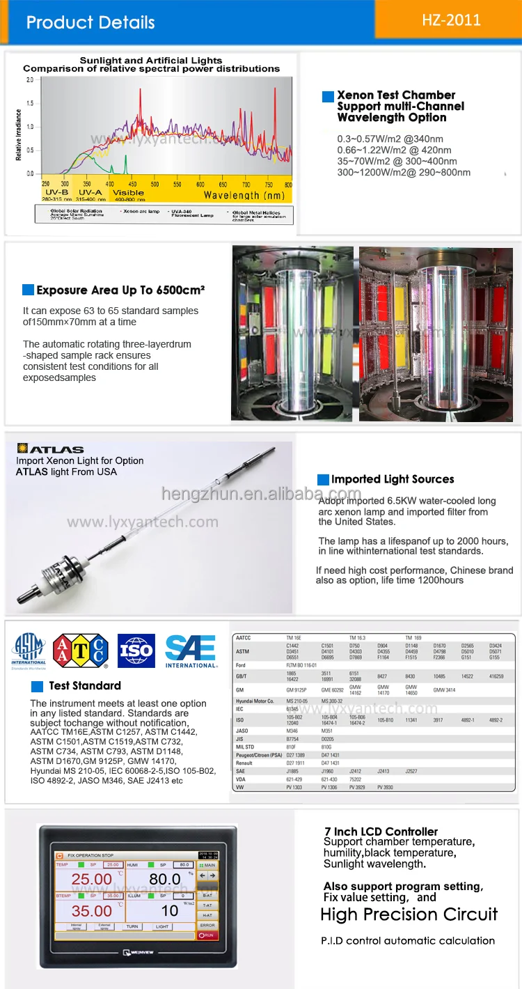 Lixian Brand Fabric Xenon lamp aging test chamber is dedicated to the analysis and testing of rubber, plastic, paint, paint and other chemical materials, the main services: performance testing, aging testing, composition analysis, formula research and development. This section is mainly to list some of the test standards for the test of various industries reference. Product meet ISO, DIN,ASTM, SAE etc test standard.AATCC TM 16, Colorfastness to Light