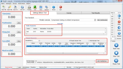 ~can set sample parameters, set fixed speed, locate shift, concentration and other tests ~Change the left side of the display of the software, optional maximum force, deformation, displacement, etc ~Test standards and test requirements can be edited