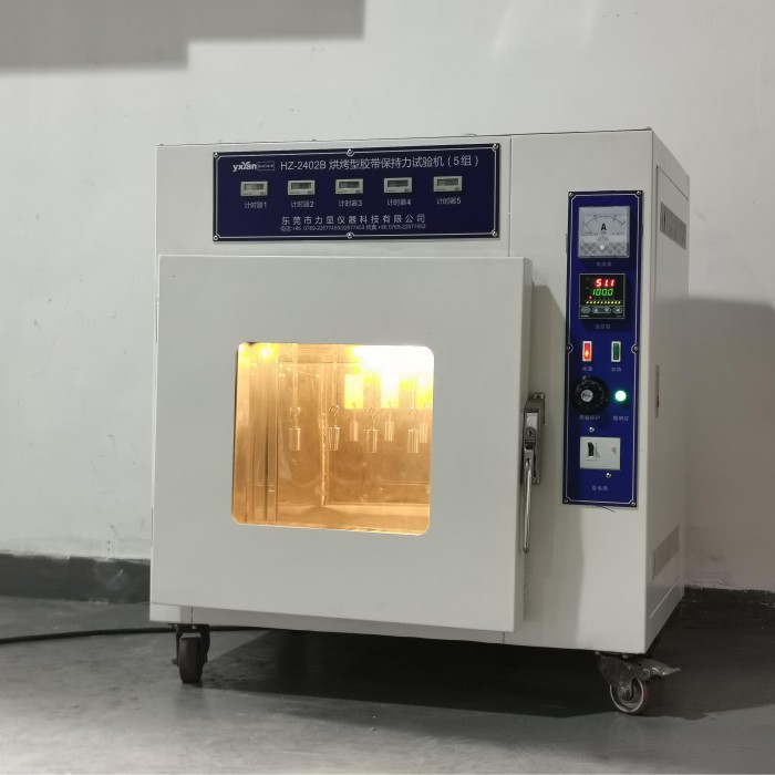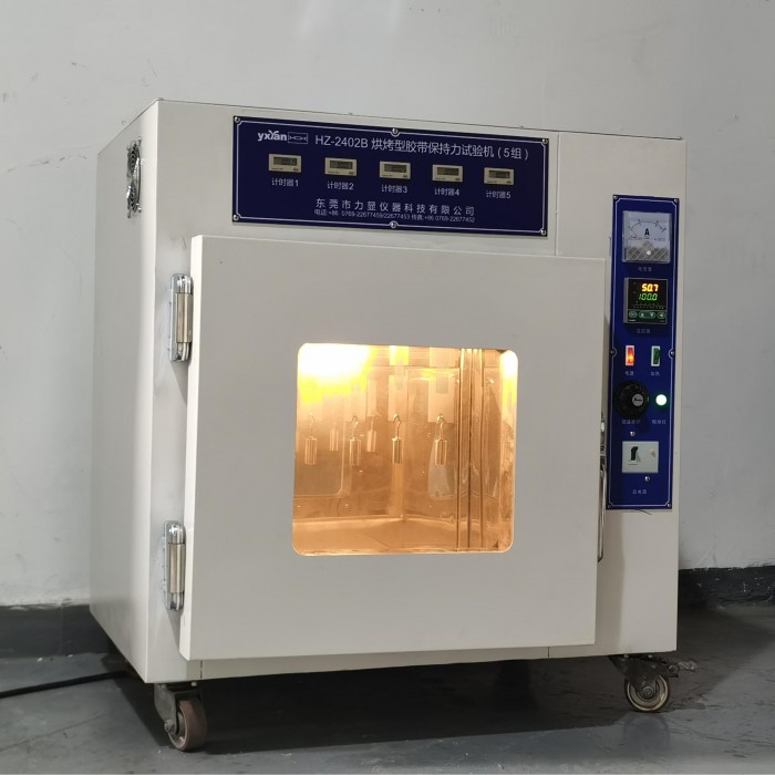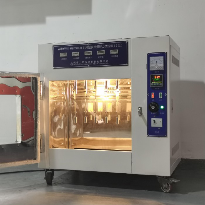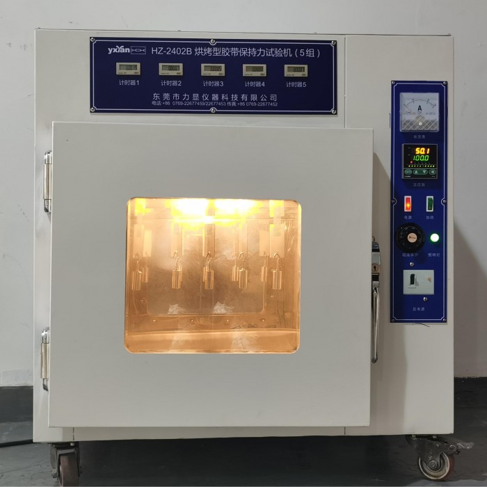 Oven-type tape retention tester is widely used in adhesive products industries such as adhesive tape, protective film, sticker, label, foam, adhesive, etc., for testing the adhesive tape retention at a certain temperature. Oven-type tape retention tester tests the ability of adhesive tape pasted on the test board in a specified way at a certain set temperature to resist displacement under the action of specified gravity along the length direction, and uses the time for the test piece to move a certain distance (or completely detach) and the distance moved in a certain time (or completely detached) to indicate the adhesive tape retention.
